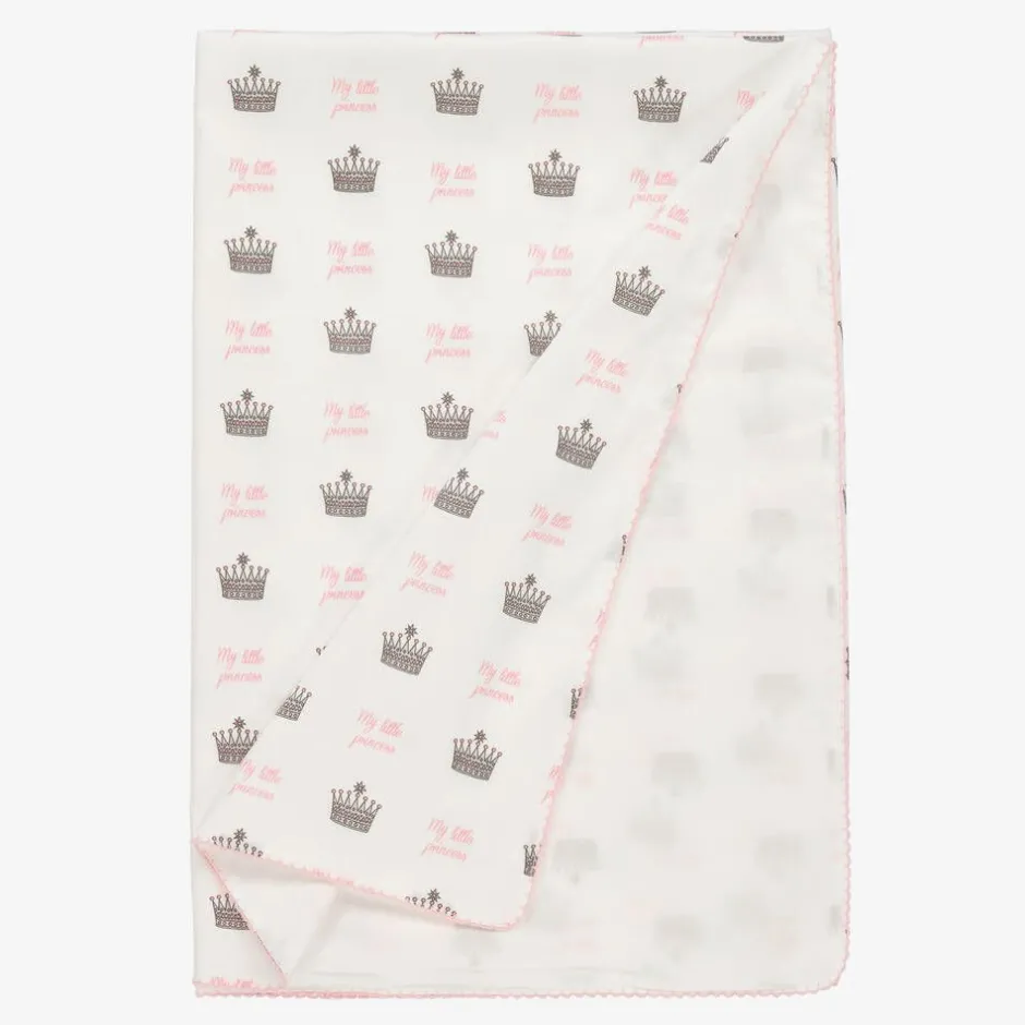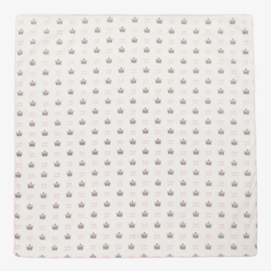 A lovely ivory blanket for baby girls from British brand Rachel Riley, made in silky, soft cotton. This lightweight blanket has an adorable grey princess crown print, with the words 'My Little Princess' in pink and sweet pink picot trims.