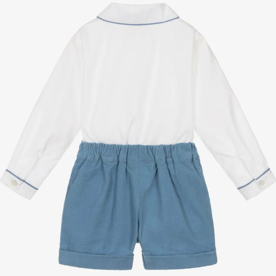 Traditional blue shorts set for boys from Rachel Riley, made in soft cotton. The ivory shirt is made from a soft piqué and has a smart collar, blue trims and fastens with buttons down the front. The coordinating blue shorts are made in soft corduroy and have turn-up cuffs and a partially elasticated waistband for a comfortable fit. This smart set fastens together with buttons, so the shirt will always stay neatly tucked in.