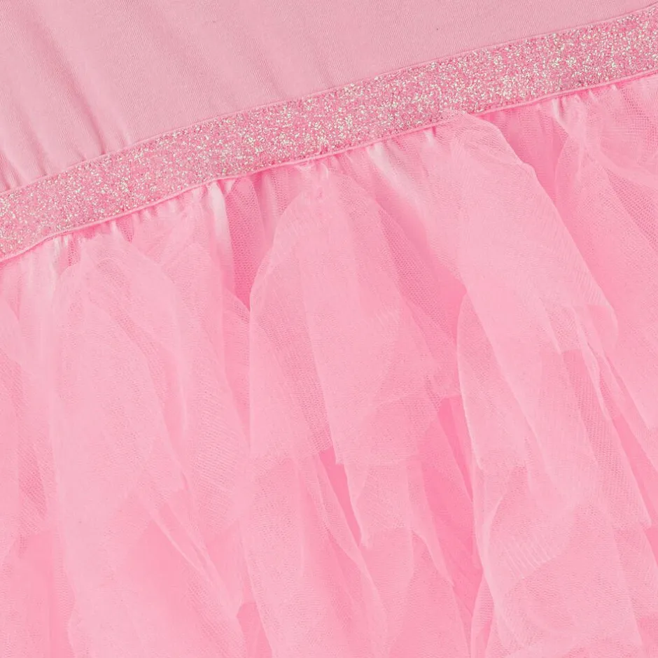 A bright pink dress for girls by British designer Rachel Riley, lovely for parties and celebrations. Trimmed with layers of fabulous tulle, this fun dress has a bow detail on the bodice, a glittering, elasticated waistband, and a ruffled skirt that is full of flounce. Both made in cotton for comfort and simple dressing, the bodice is stretchy jersey and the skirt lining is lightweight voile.
