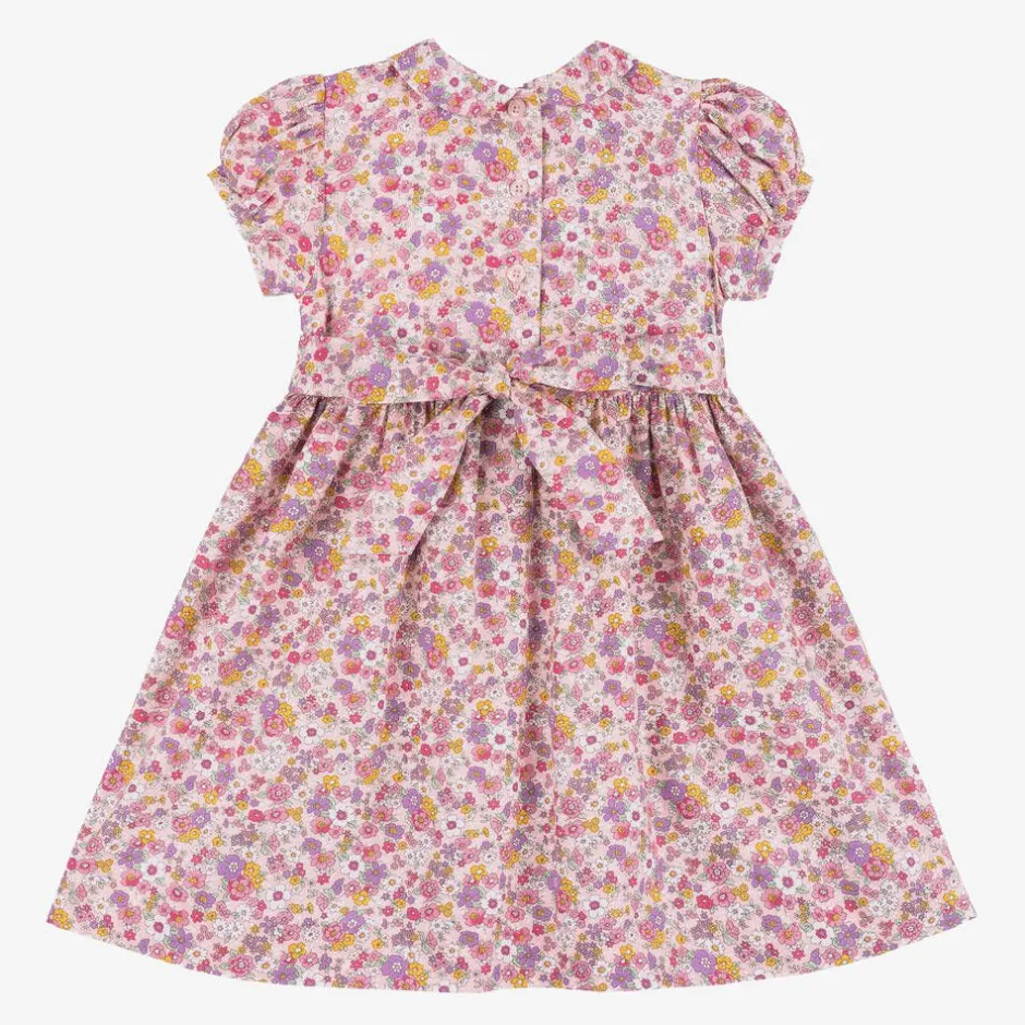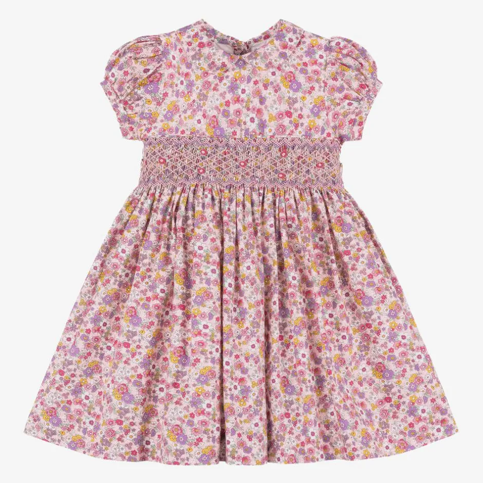 Rachel Riley Girls Pink Floral Smocked Cotton Dress Outlet