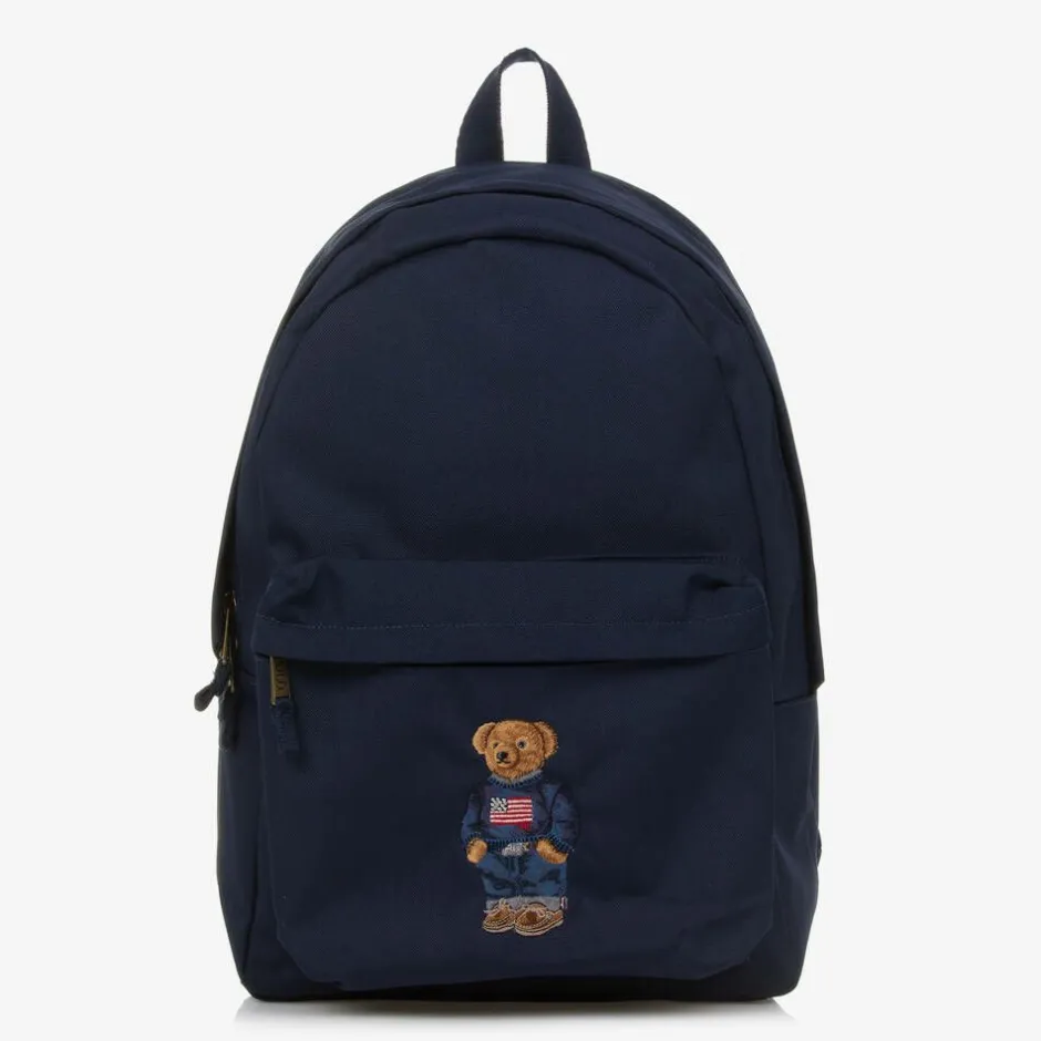 Blue canvas backpack for boys by Ralph Lauren, with the brand's iconic Polo Bear embroidered on the front. Great for school and carrying everyday essentials, this practical design has a spacious main compartment with a useful separate laptop sleeve on the back, both fastening with branded zips. There is a smaller zip-up front compartment, a slip pocket on one side, ideal for bottles and a useful carry handle. Completing the stylish designer look, a large logo is embroidered on the back in tonal thread and a branded tab can be seen on one of the adjustable, padded shoulder straps.