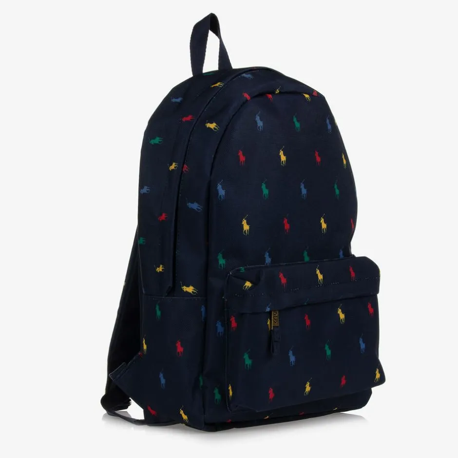 Navy blue backpack for boys and girls by Ralph Lauren, patterned with the brand's red signature pony logo. Made in sturdy canvas, it has a spacious main compartment and an exterior pocket, both are zip-fastening with branded bronze-tone metal pulls. Great for school, it also features a laptop sleeve, a side slip pocket, a carry handle and a padded backing. The adjustable shoulder straps come with useful chest straps for extra support and comfort when carrying the bag around.