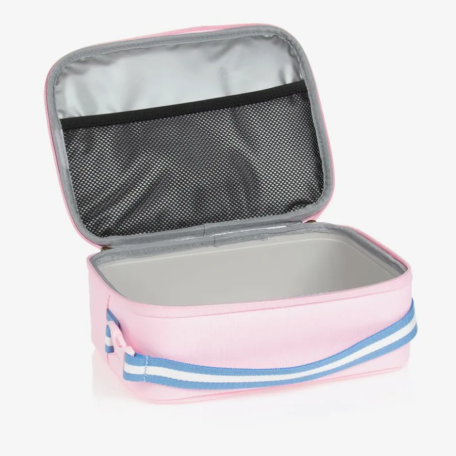 Pink insulated lunch box for boys and girls by Ralph Lauren, with the iconic Big Pony logo embroidered in blue. It is made in hard-wearing nylon canvas with a clip fastening woven carry strap. The spacious interior has a moulded plastic compartment with a mesh pocket on the insulated lid, helps keep school packed-lunch fresh for longer. The zipped main compartment and slide pocket has matching logo-branded bronze metal zip pulls and there is a small Polo logo tab on the side.