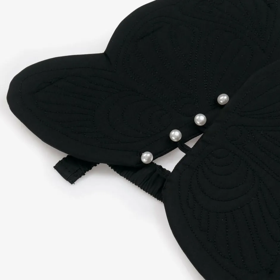 A black butterfly-shaped top for girls by British brand RaspberryPlum. This lovely dressing-up accessory is made in silky smooth fabric, with beautiful embroidery detailing. It has faux pearl button fastenings down the front, with elasticated back straps for comfortable wear.
