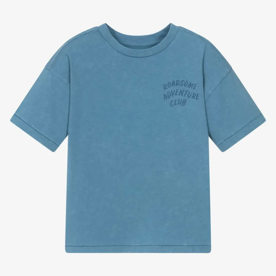 Blue, organic cotton T-shirt for boys and girls by Roarsome, made in soft slub jersey with a cool washed effect. An oversized, drop-shoulder fit, this casual tee features the brand's Reef the Shark print on the back and 'Roarsome adventure club' on the front.