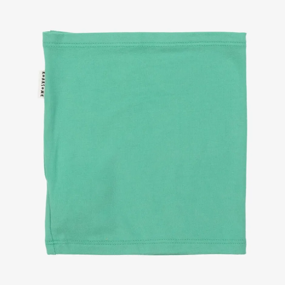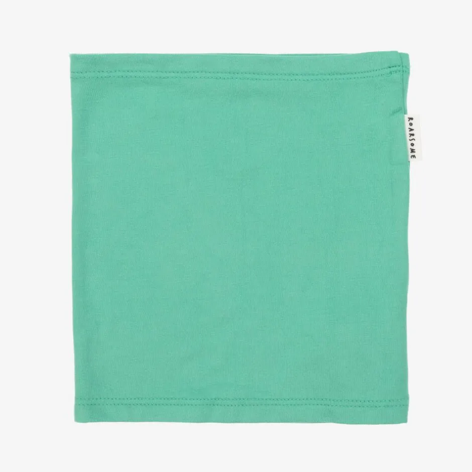 Light green snood for boys and girls by British brand, Roarsome. It is made in soft and stretchy bamboo jersey with a natural temperature-regulating quality. Simply pulls over the head, it is super comfortable to use as a neck warmer under skiwear.