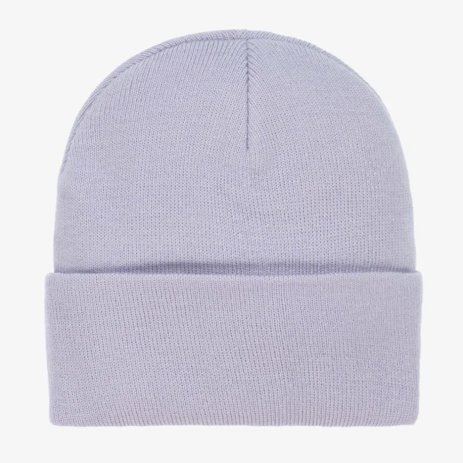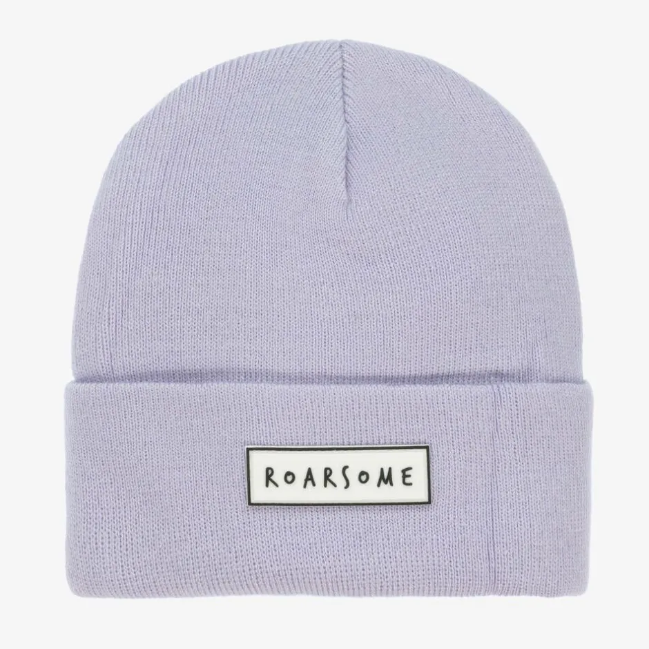 Light heather purple beanie hat for girls by Roarsome, knitted in a cosy double layer from soft recycled yarn. Great for the outdoors, this lovely accessory has a turned-up brim with a rubberised logo patch on the front.