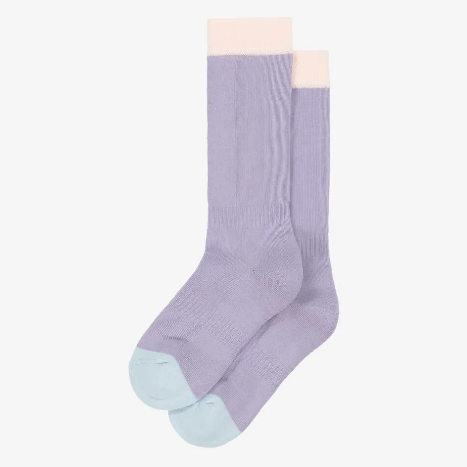 Lilac purple socks for girls from Roarsome, knitted in a soft organic cotton blend. The cuff and toes are contrasting pink and blue for a fun finish. Ideal for keeping little toes warm, they have terry panelling inside for added comfort.