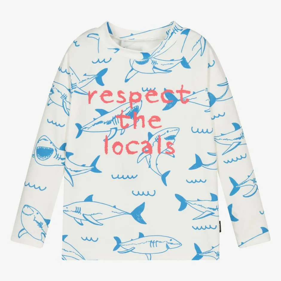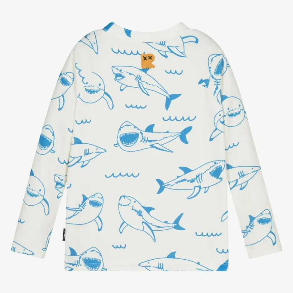 From Australian brand Rock Your Baby, an ivory sun-protective swim top for boys. Made in stretchy silky fabric with UPF 50+, a high neckline and long sleeves this top provided coverage in the sun. It is patterned with blue sharks with a large red slogan on the front for a fun look in and around the water. Parts of this garment are made from recycled fabrics.