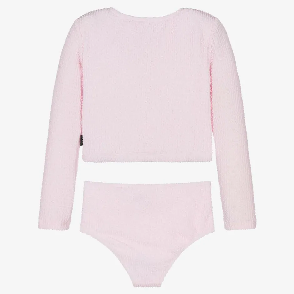 A lovely pale pink tankini for girls by Rock Your Baby, made in a stretchy, crinkle-textured fabric. Lined for comfort, the long-sleeved top has a rounded neckline and the bikini bottoms are gently elasticated for a comfortable fit.