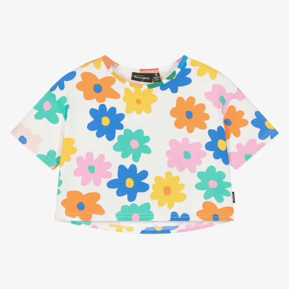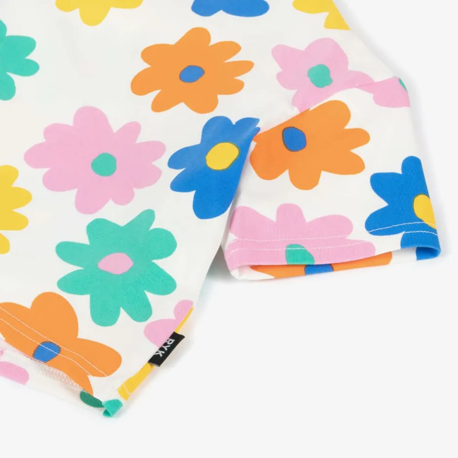 A white boxy T-shirt for girls by Rock Your Baby. Made in soft cotton jersey, this comfortable tee is patterned with multicoloured abstract flowers for a fun finish.