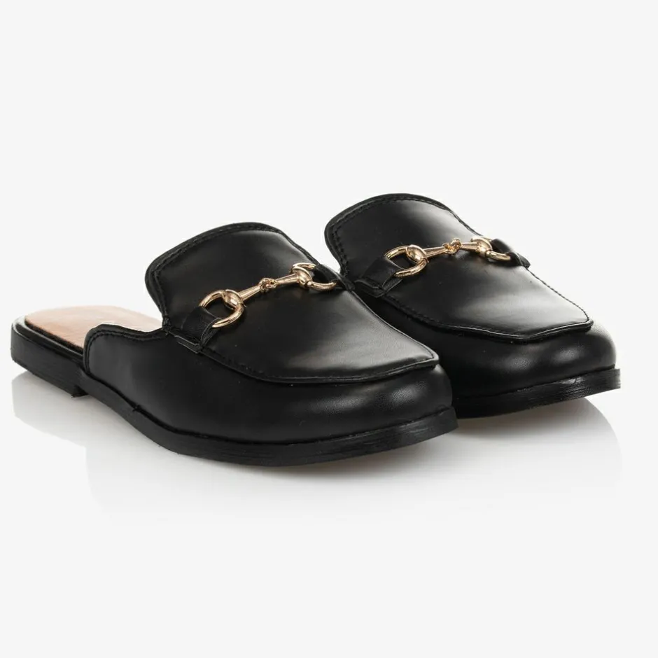 In a smart-casual style, these backless black loafers for boys and girls are by British brand Romano. Made and lined in soft faux leather, these slip-on shoes have a gold horsebit detail across the toes and a smooth rubberised outsole.