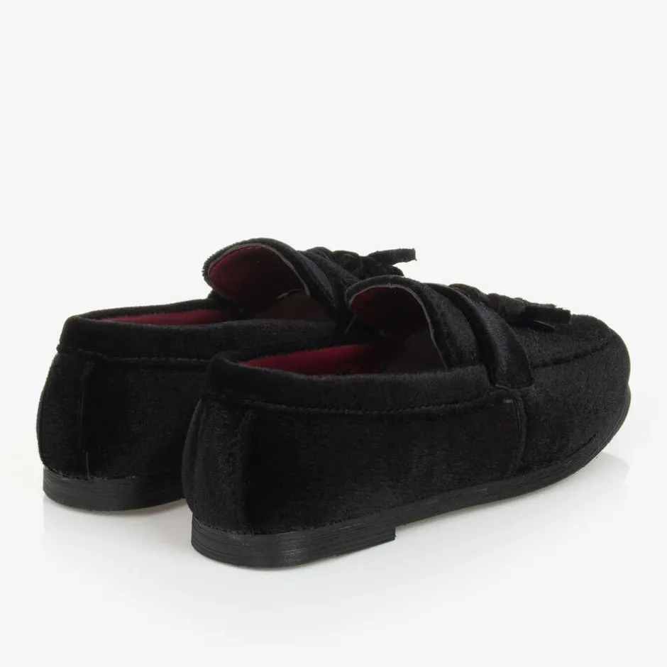 Smart black velvet loafers for boys by Romano, with classic tassel detailing on the toes. Super stylish, they are lined in burgundy red faux leather and have a sleek rubber outsole for a sophisticated look.