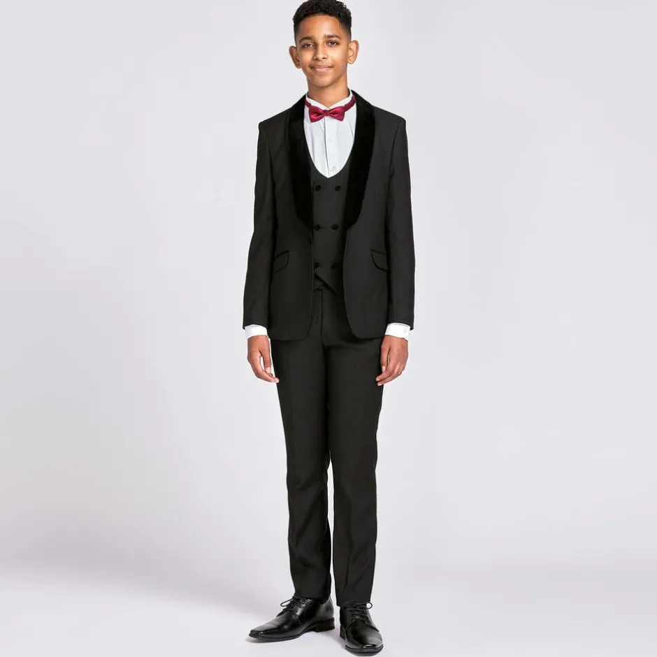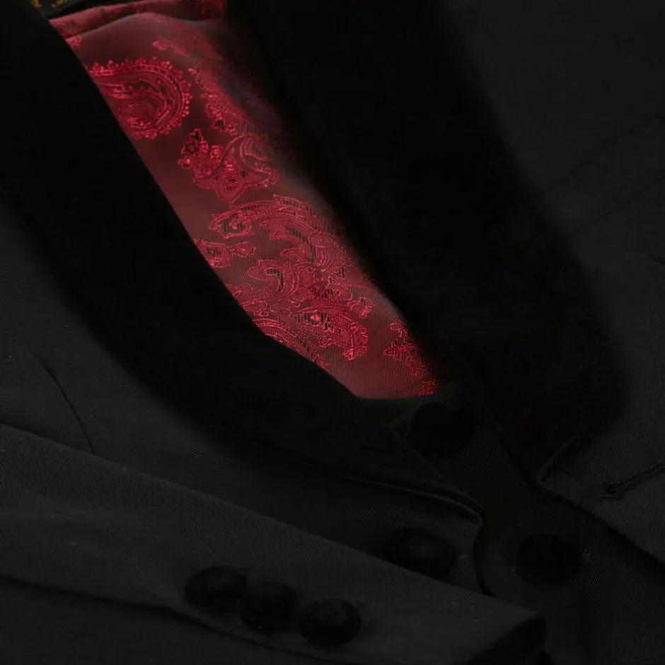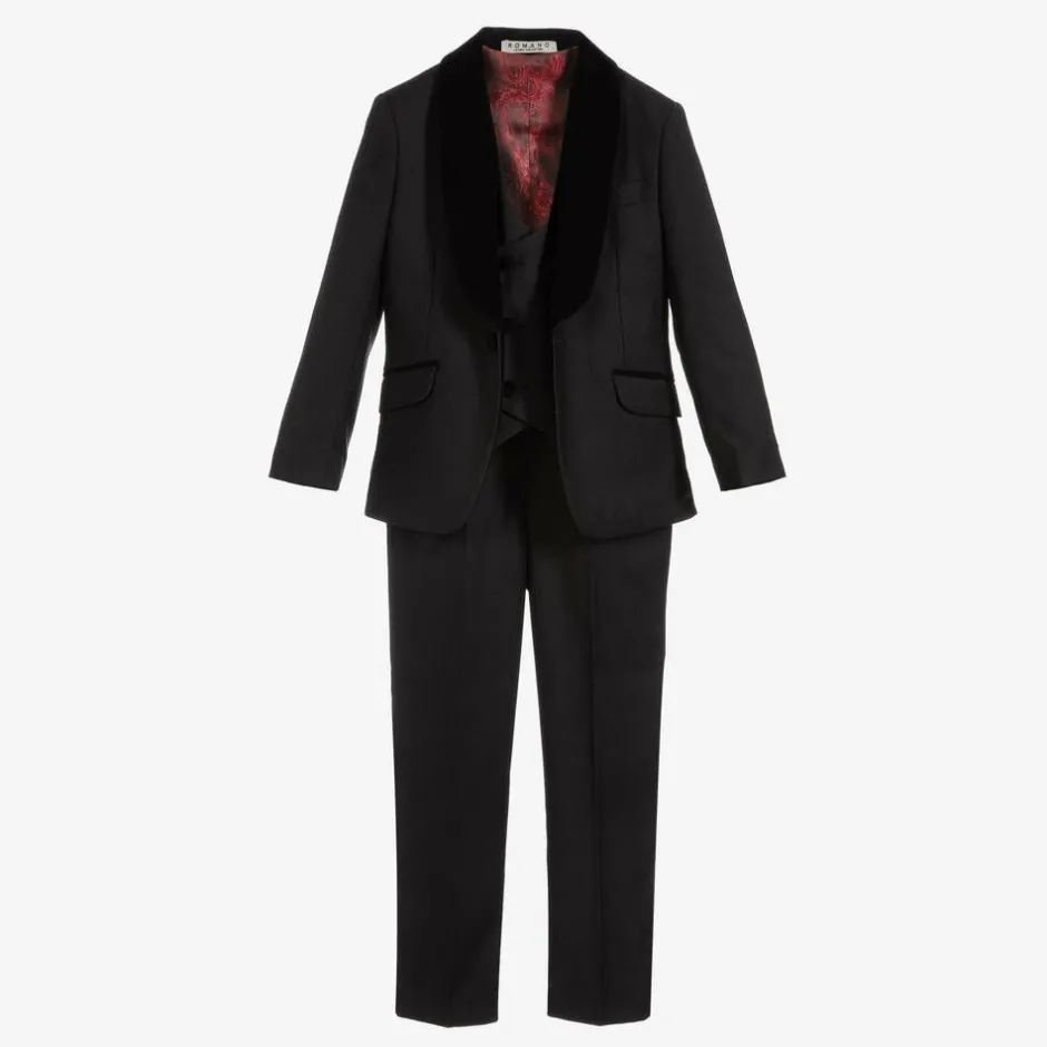 Boys beautifully tailored black suit by Romano, made in a soft viscose blend fabric. The jacket has a velvet shawl collar, trim, and buttons. It is lined with a stunning, red, silky polyester jacquard to match the back of the waistcoat. The matching trousers fasten with a button and zip, and have an elasticated waist on the smaller sizes.