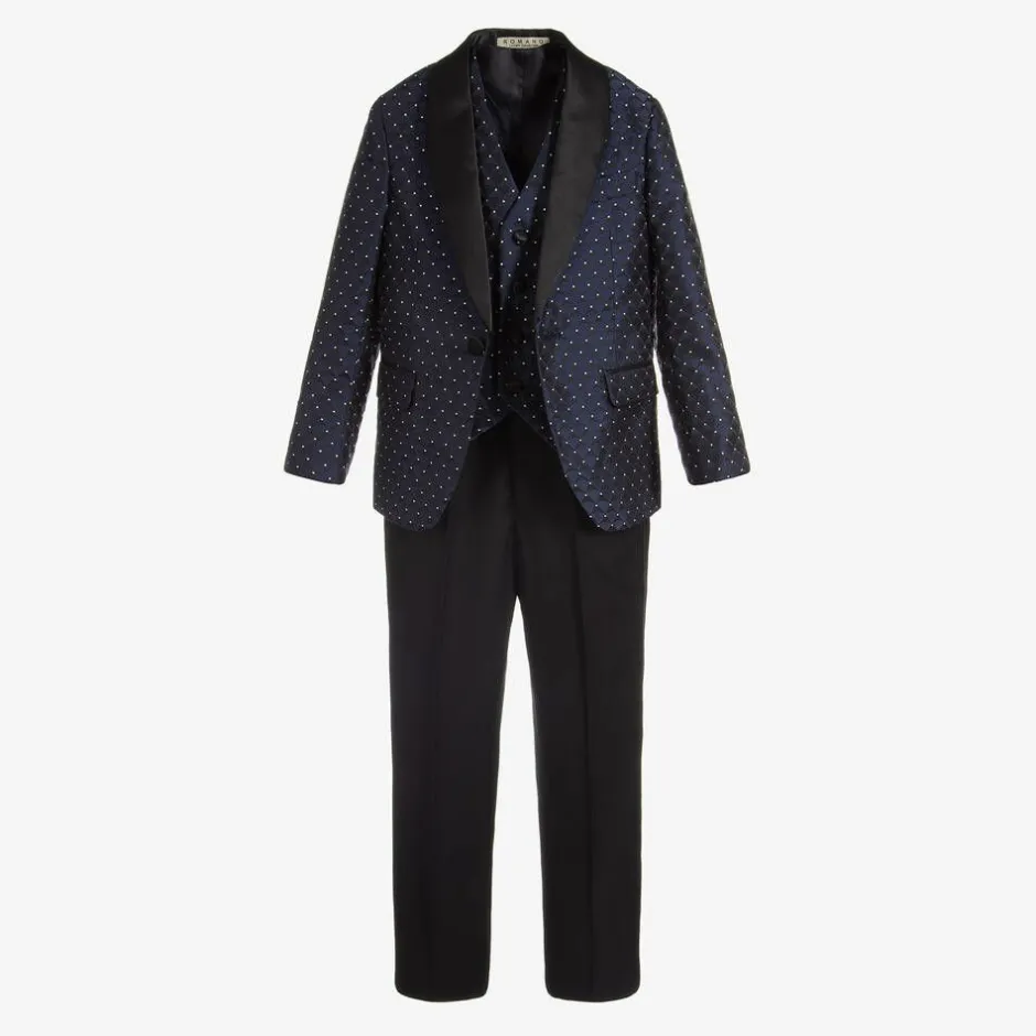 Boys special occasion suit by Romano. It has a patterned blue satin jacket and waistcoat, with plain black trousers. The waistcoat can be adjusted on the back and the trousers have piped satin side seams and an elasticated waistband.