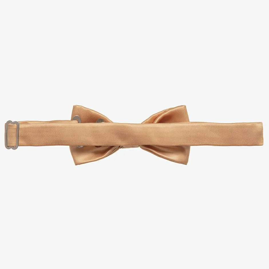 Super smart and stylish, this gold bow tie for boys is handmade by Romano. An elegant accessory for a special occasion outfit, it is made from silky satin, and has an adjustable strap with a hook and eye fastening.