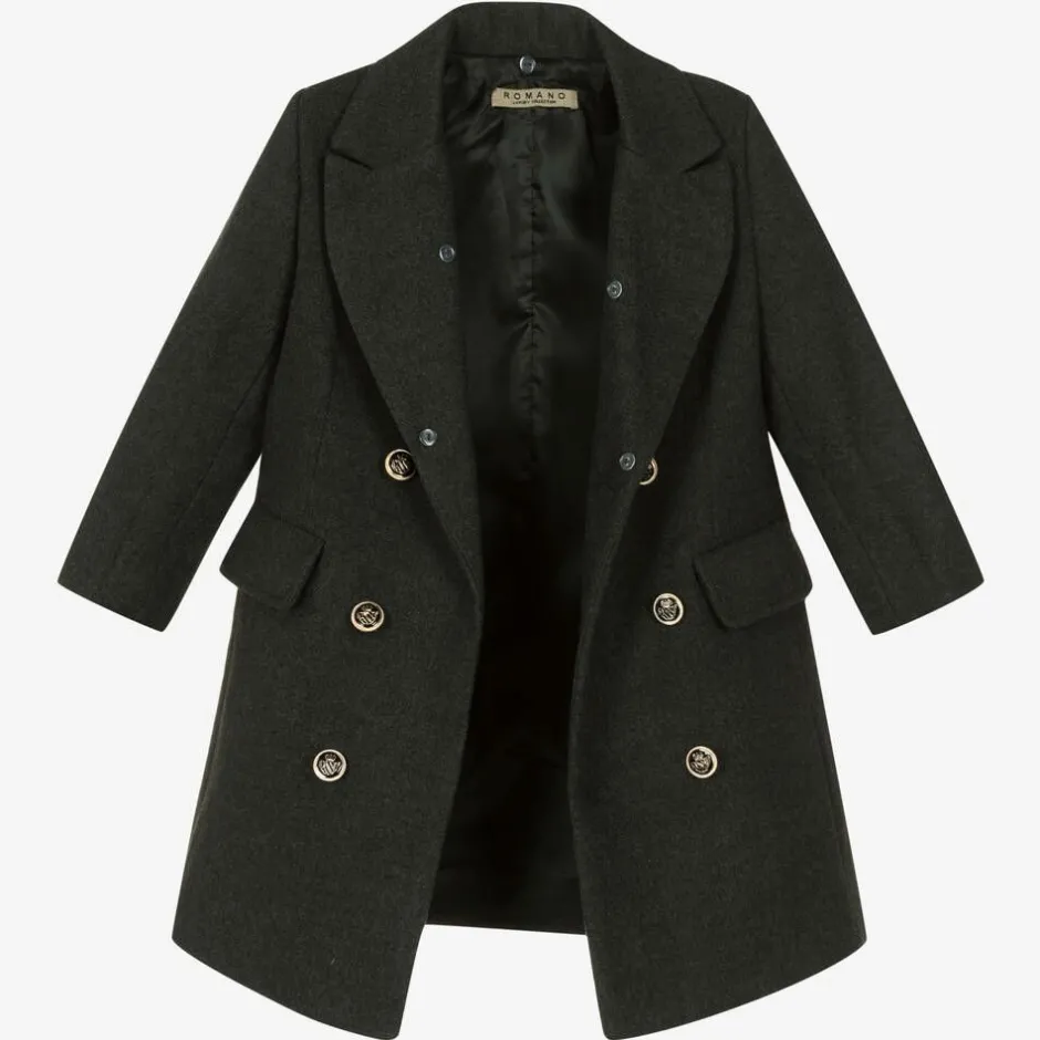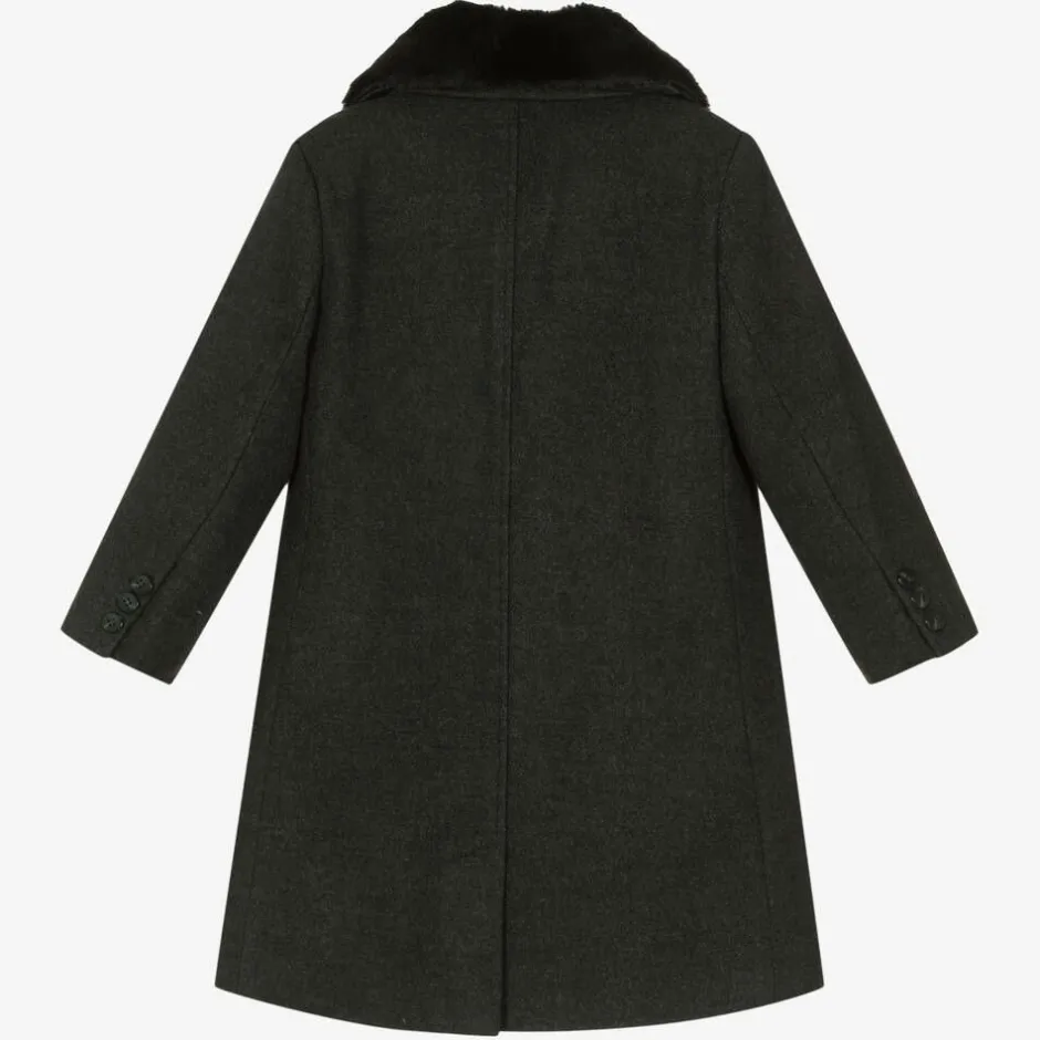 Smart grey coat for boys by British brand Romano. It has a revere collar with an eye-catching, removable, black faux fur trim and black enamelled crest button fastenings with shiny silver detailing. Made in super soft, peached, mid-weight fabric, the coat has front flap pockets and a satin lining. There are faux buttons on the cuffs.