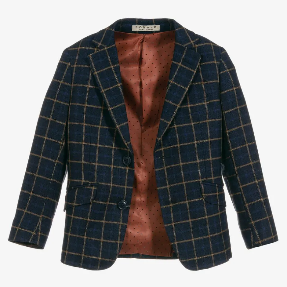 A smart navy blue suit for boys by Romano, with a beige and bright blue check pattern. It is made in a soft viscose-blend fabric and beautifully tailored. The jacket has a copper-coloured silky lining, patterned in navy blue jacquard dots to match the back of the waistcoat. The matching trousers have a zip, button, and a hook and eye fastening.