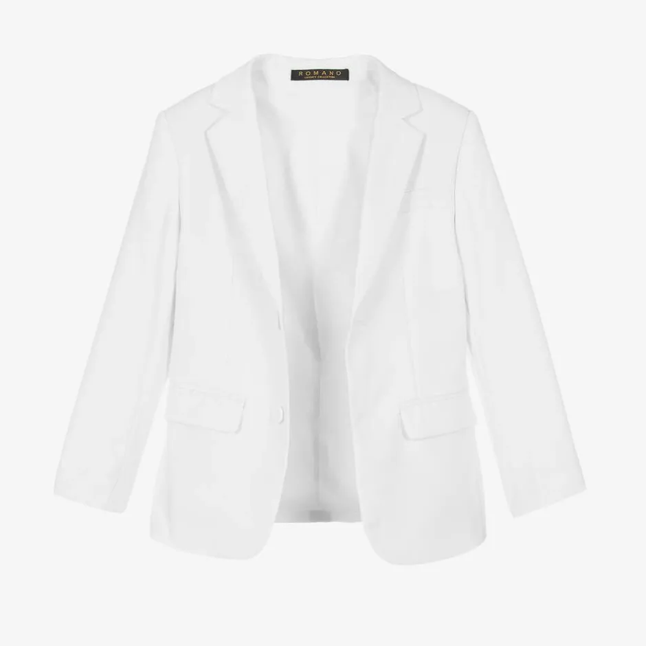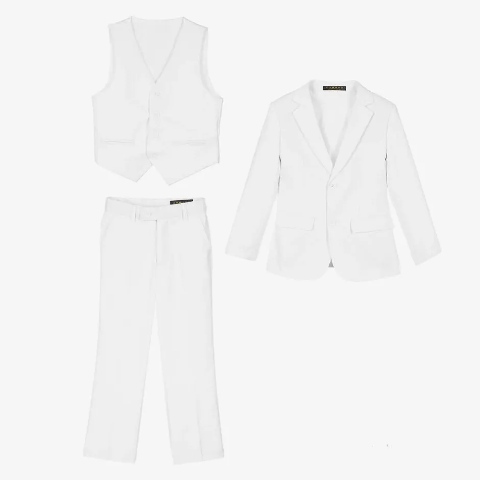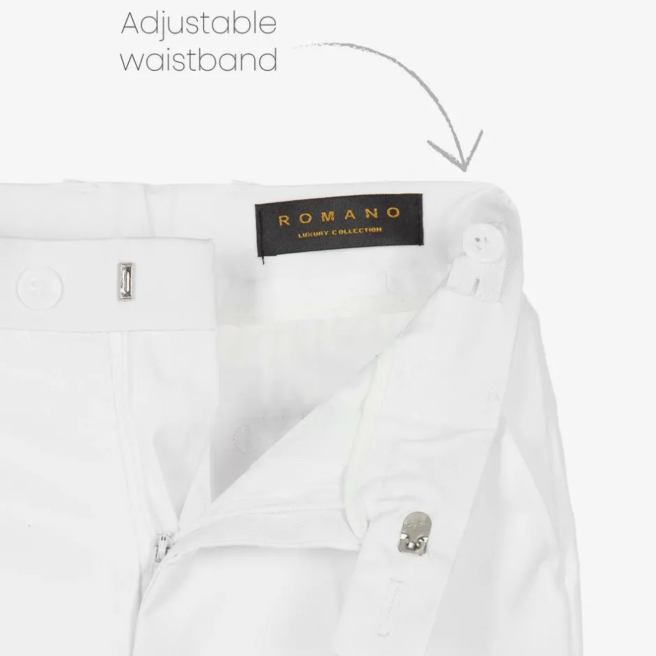 From the luxury collection, a smart white suit for boys by Romano, made from a soft cotton blend twill. Great for special occasions, the blazer jacket has a classic lapel collar, button fastenings, and front pockets with a flap closure. The matching waistcoat has button fastenings on the front and a silky satin panel on the back for a comfortable feel. The adjustable buckle strap on the lower back allows for a great fit. The pair of white twill trousers are fitted with an adjustable waistband and complete the formal look.