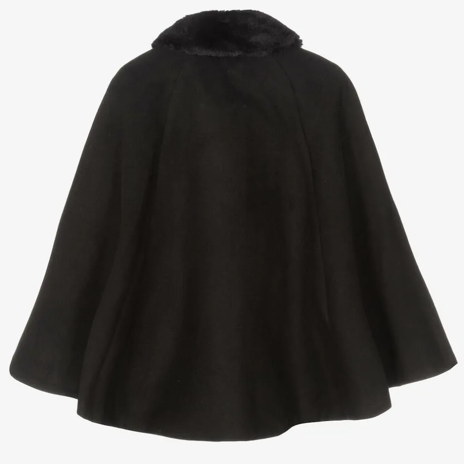 Smart black cape for girls by Romano, with a detachable faux fur collar. It has a soft felted feel and a satin lining. It fastens with decorative ivory and gold crest buttons and has matching buttons on the arm openings.