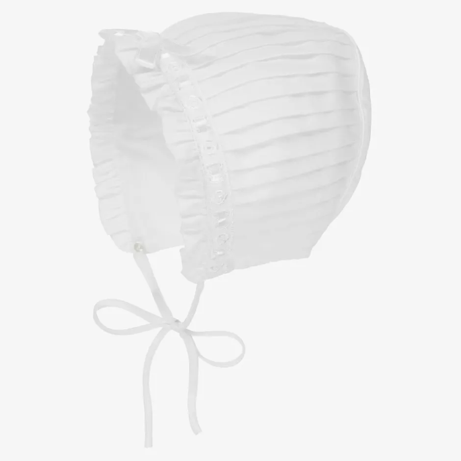 Baby girls traditional white pleated bonnet by Sarah Louise. It is made in soft polycotton. with a pretty broderie anglaise and ribbon trim. The back is gently elasticated and it ties under the chin to keep it in place.