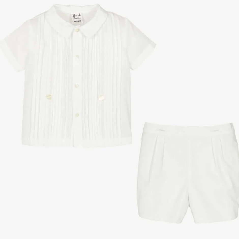 Smart and traditional, an ivory cotton-blend shorts set for little boys by Sarah Louise, made in lightweight poplin. The shirt has beautiful, hand-embroidered pin-tuck detailing, whilst the lined shorts have an adjustable, semi-elasticated waist for a great fit. The shirt buttons onto the shorts, keeping boys neat and tidy.