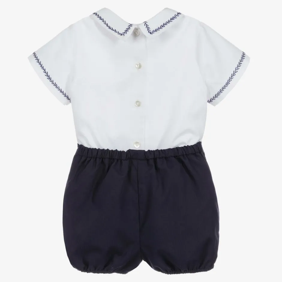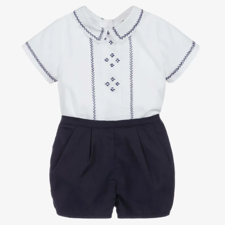 Younger boys white and navy blue shorts set from Sarah Louise, made in soft and lightweight polycotton. The shirt has pretty navy blue embroidery and pintuck pleating. The shorts are fully lined, with an elasticated waist and leg cuffs.