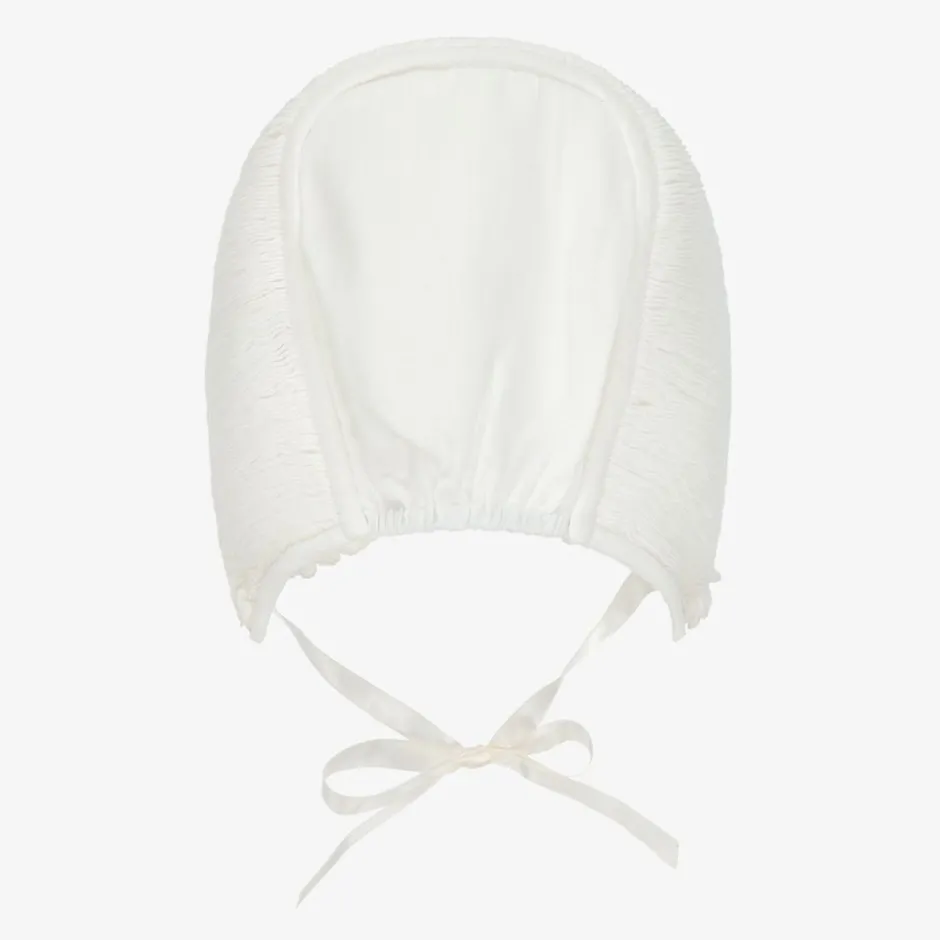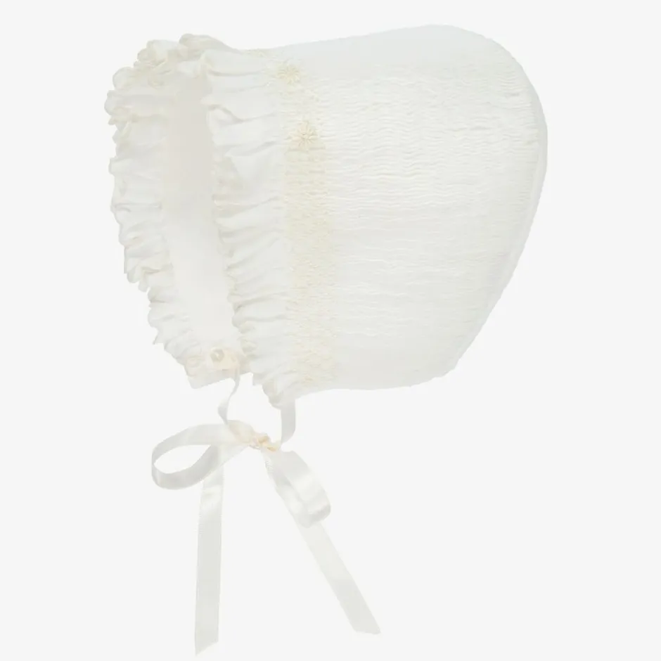 A traditional, ivory hand-smocked bonnet for baby girls and boys by Sarah Louise. Made and lined in soft polycotton with hand-embroidered flowers, it has a silky ribbon to tie under the chin.