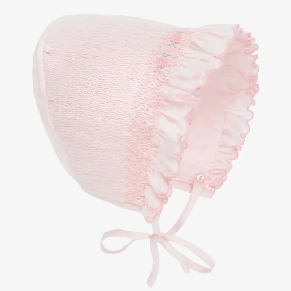 A traditional, hand-smocked pale pink bonnet for baby girls by Sarah Louise. Made and lined in soft polycotton with hand-embroidered flowers, it has a silky ribbon to tie under the chin.