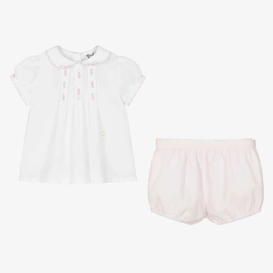 Younger girls pink and white traditional style shorts set by Sarah Louise. Made in soft polycotton, with pleating, pretty scalloped trims and pink and green hand-embroidery. The top cleverly buttons onto the lined shorts for a neatly tucked in look.