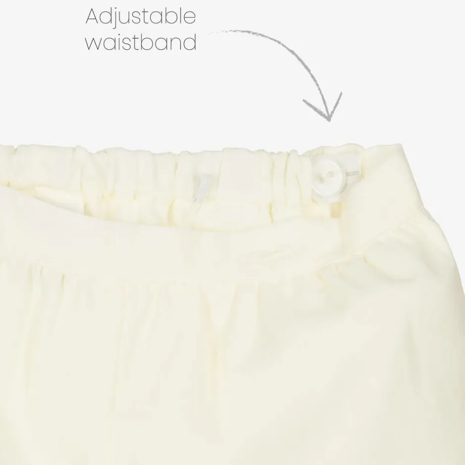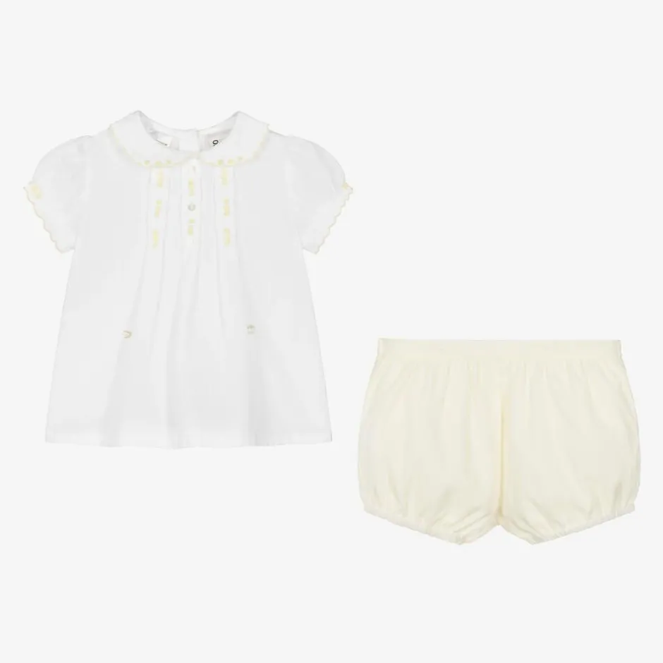 Younger girls yellow and white traditional style shorts set by Sarah Louise. Made in soft polycotton, with pleating, pretty scalloped trims and blue and green hand-embroidery. The top cleverly buttons onto the lined shorts for a neatly tucked in look.