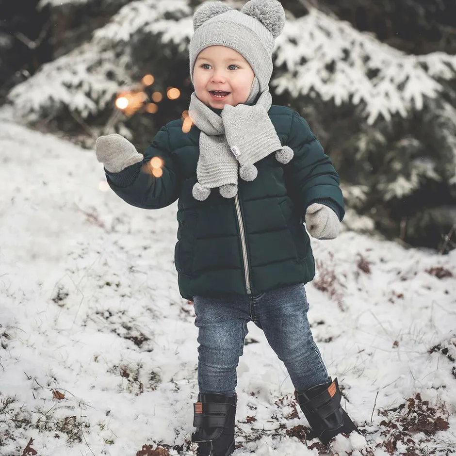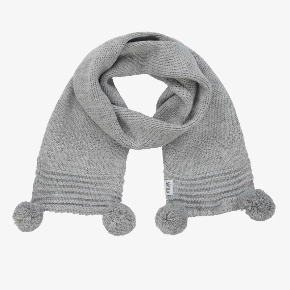 A grey knitted scarf for little boys and girls by Sätila of Sweden, decorated with sweet little pom-poms. Cute and cosy, this accessory is designed to keep them warm on cold days.