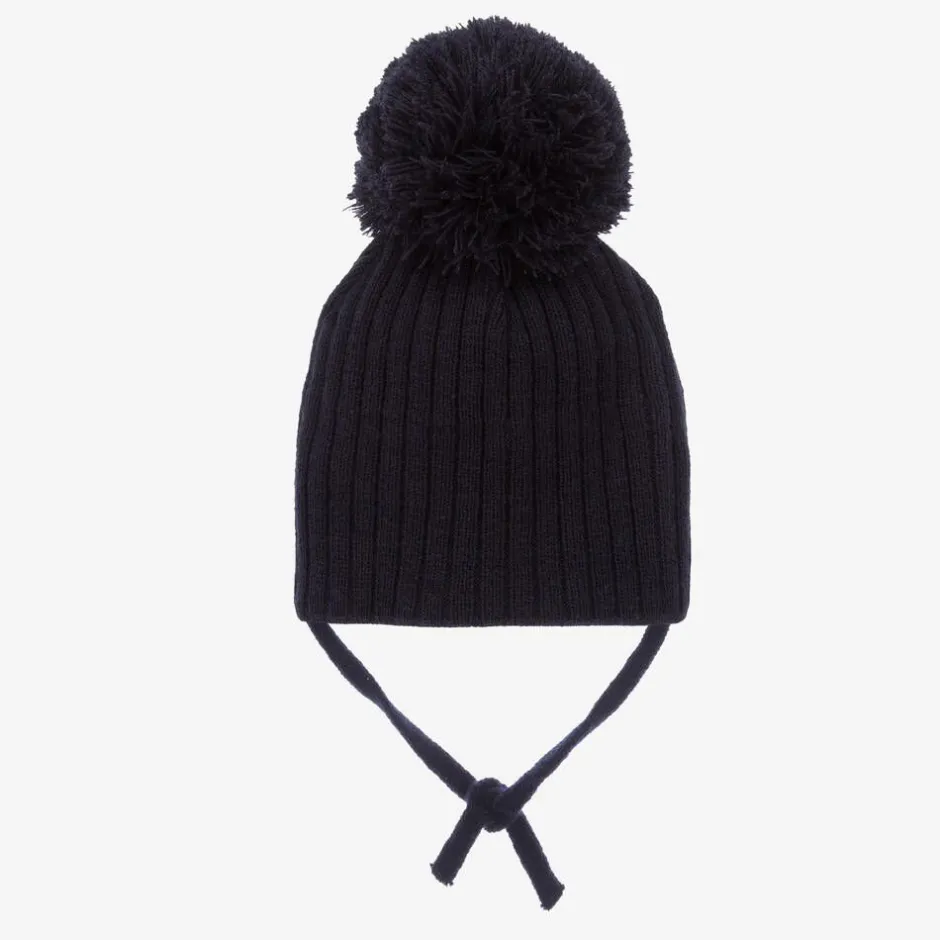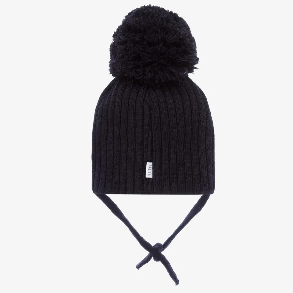 Warm and cosy, this navy blue winter hat for boys and girls by Sätila of Sweden is made from a stretchy ribbed knit. Partially lined in knitted cotton for extra comfort, it has a large pom-pom on top for an adorable finish. Smaller sizes have practical ties to fasten under the chin.