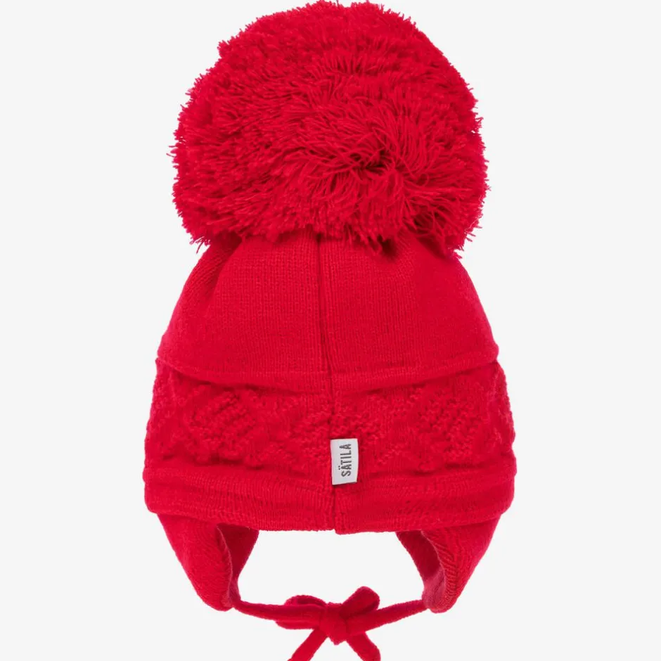A red beanie for little boys and girls by Sätila of Sweden, in a soft and cosy knit. It has a lovely chunky diamond pattern and a giant pom-pom on the top for a charming look. Shielding them in colder weather, the hat is finished with ear flaps and ties neatly under the chin.