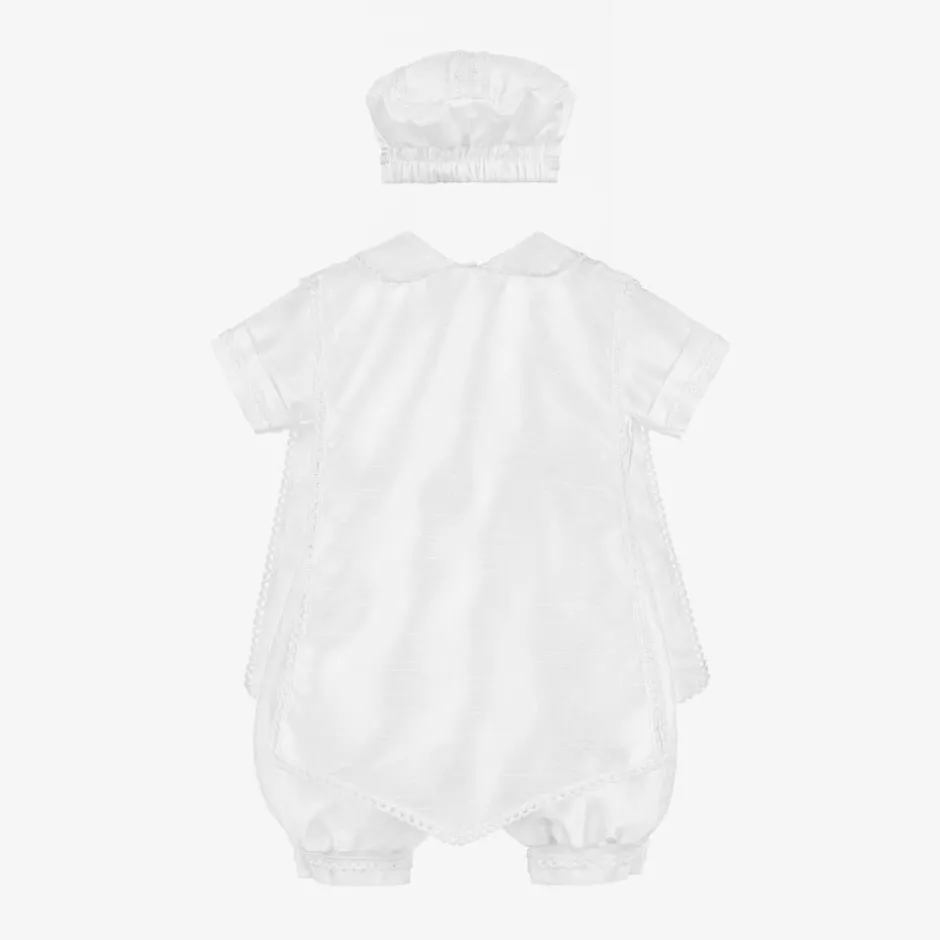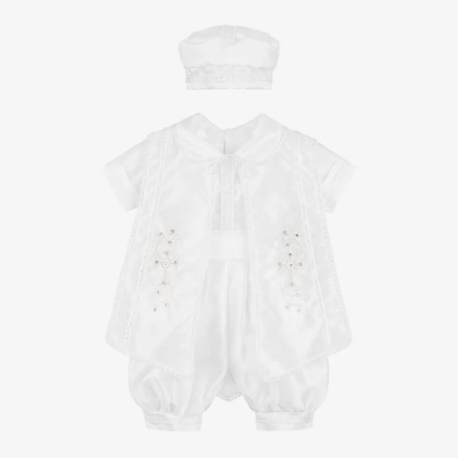 Baby boys white shorts set by Sevva, ideal for a religious ceremony. This traditional outfit includes a collared shirt, lace-trimmed knickerbockers and a coordinating hat. The white waistcoat has a stole-like front, with ornate religious Cross iconography and intricate embroidery. Both the top and knickerbockers fasten with buttons, and the heritage hat has a part-elasticated trim at the back for comfort.