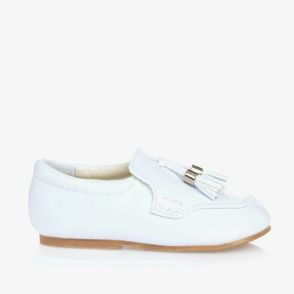 Smart white loafers for little boys by Sevva, ideal for a special occasion. They are made in glossy faux patent leather, with quintessential tassel trims. Lined in smooth faux leather, they are elasticated over the foot for easy slip on. The insoles are softly padded for comfort and the rubber soles are textured for good grip.