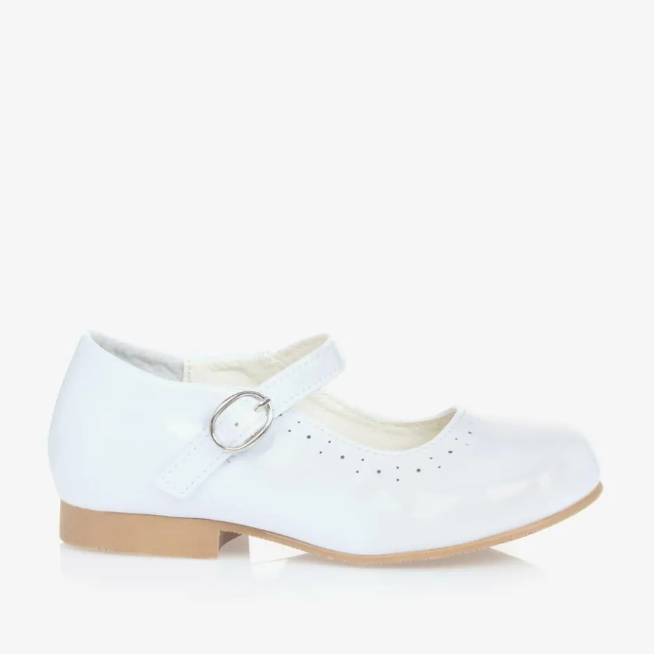 Smart white Mary Jane shoes for girls by Sevva, ideal for a special occasion. They are made in glossy faux patent leather, with perforated detailing around the top. Lined in smooth faux leather, they have softly padded insoles for comfort and textured rubber soles for good grip. There is an adjustable buckle fastening strap to secure.