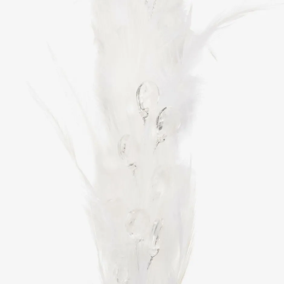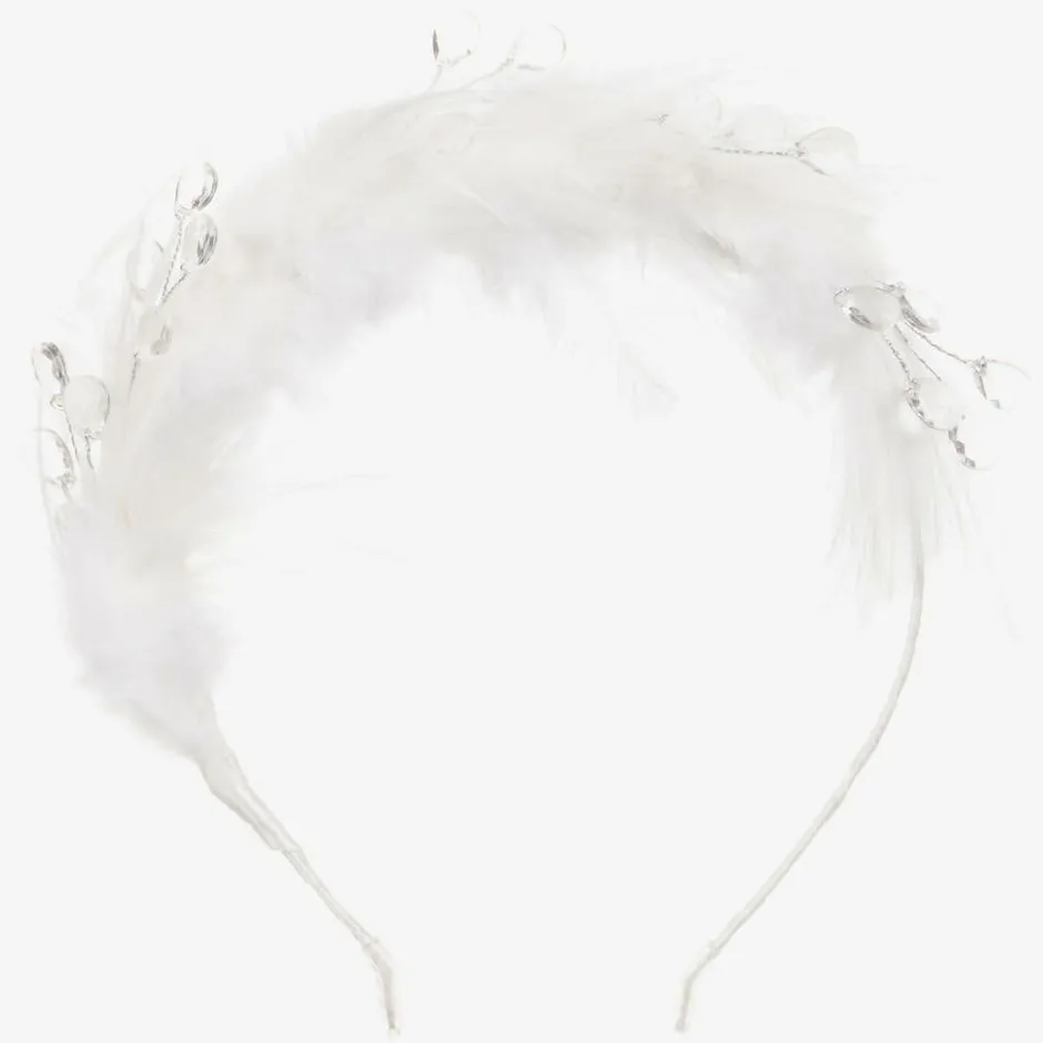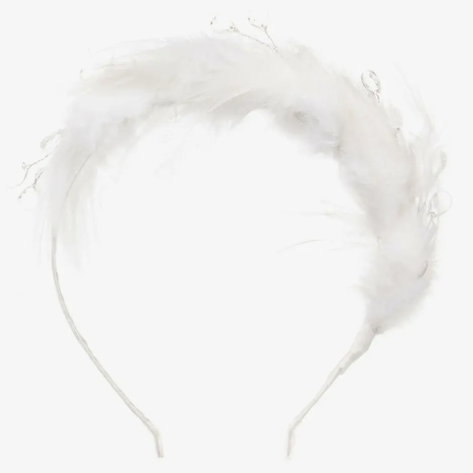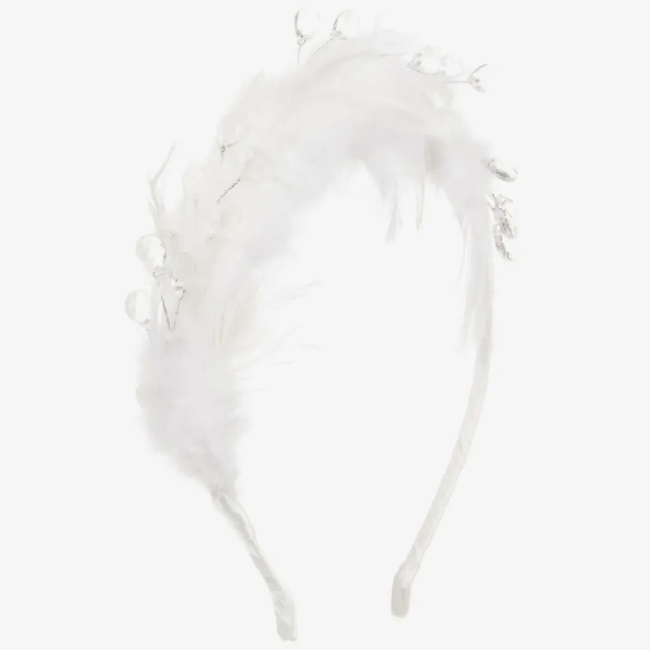 Girls pretty white handmade hairband by Sienna likes to party. The band is covered with white satin ribbon and it has soft white feathers and clear beads.