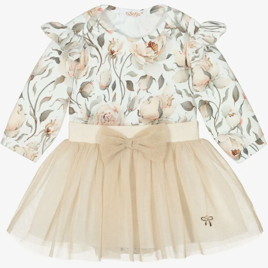 Exclusive to Childrensalon is this gold and ivory skirt set for baby girls by Sofija, made in soft cotton jersey. The ivory bodysuit has an all-over pale pink rose print, with frills on the sleeves. There is an envelope neckline and poppers between the legs to aide with dressing. The sparkly gold tulle skirt has a fixed bow on the waistband and a gold charm just above the hem.
