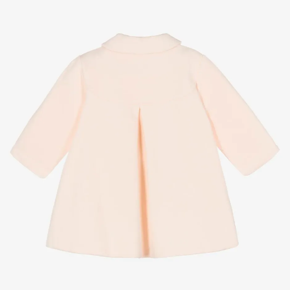 Exclusive to Childrensalon, this little girls pale pink coat by Sofija, is made in soft knitted cotton jersey. In a traditional style, it has pleated detailing on the front and rose shaped poppers, for a delicate finish.