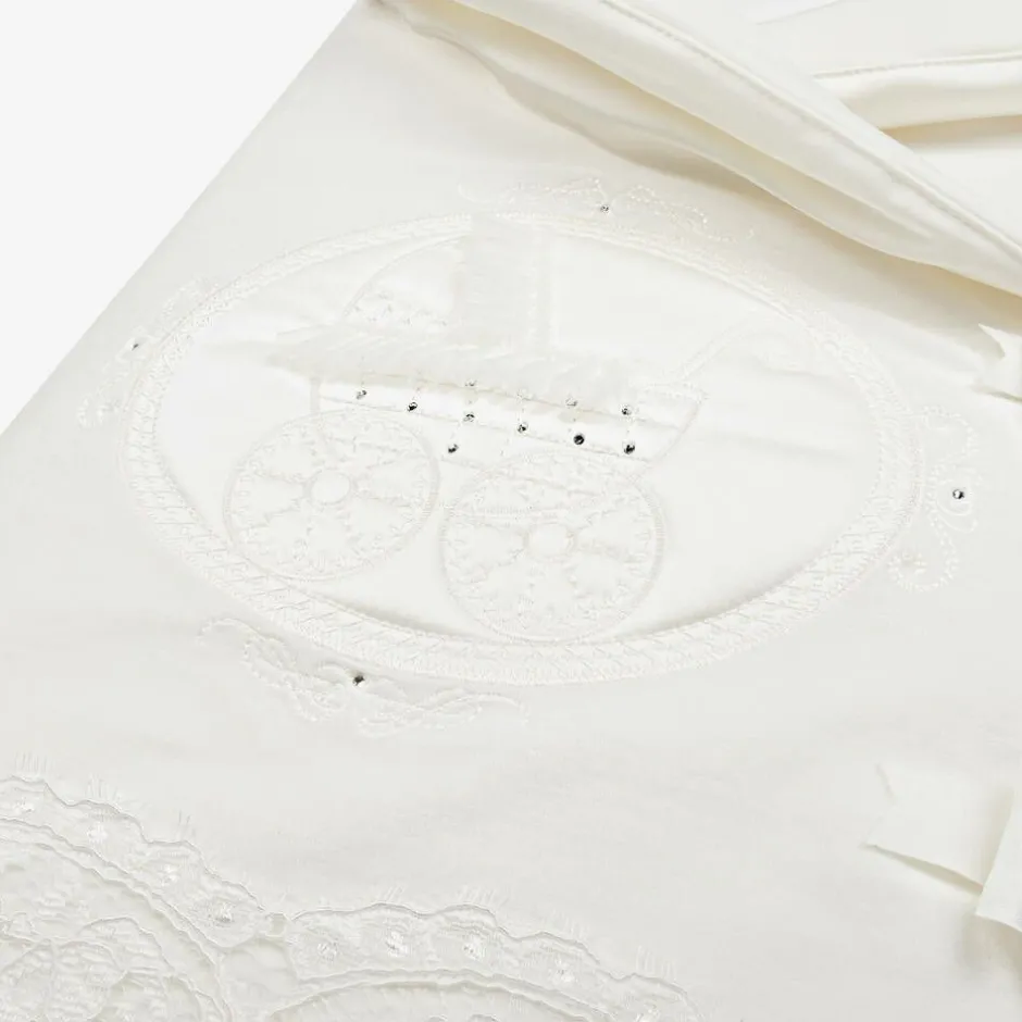 An elegant way to present a new baby, this beautiful ivory nest by Sofija will be cherished by your family. Softly padded for comfort, the nest is embellished with embroidery, satin and lace trim, perfect for baby's special day.