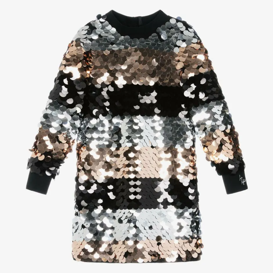 Inspired by the adult collection, this striking party dress for girls is by Sonia Rykiel Paris. Lined with soft viscose fabric, this eye-catching design is striped with black, silver and copper coloured sequins which sparkle beautifully in the light. It has a ribbed neckline and fastens on the back with a zip. The French designer's name can be seen on one ribbed cuffs in metallic silver embroidery.