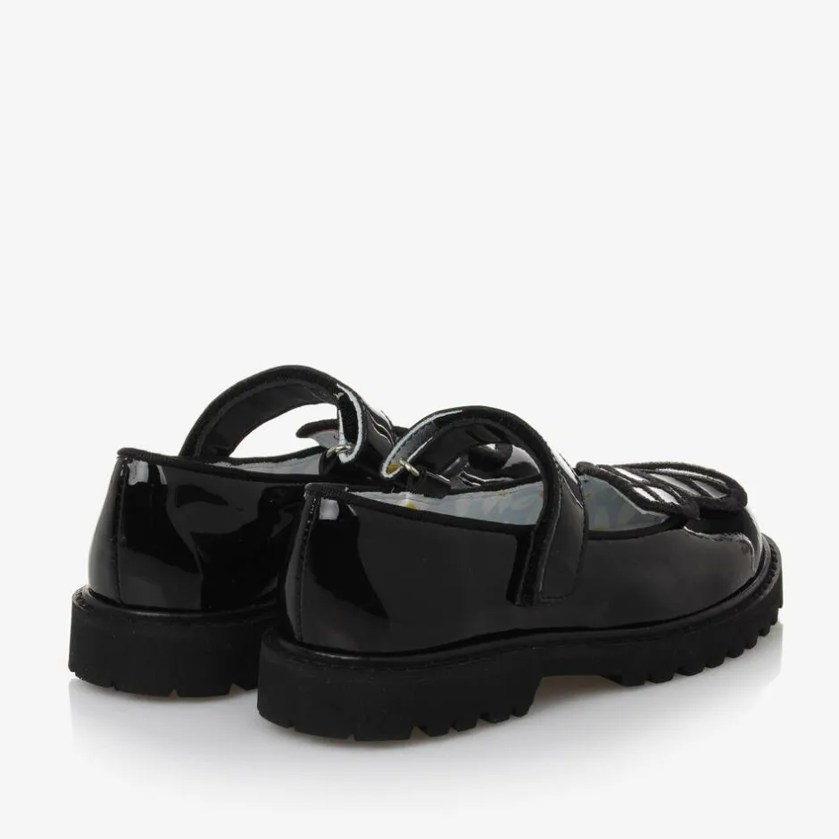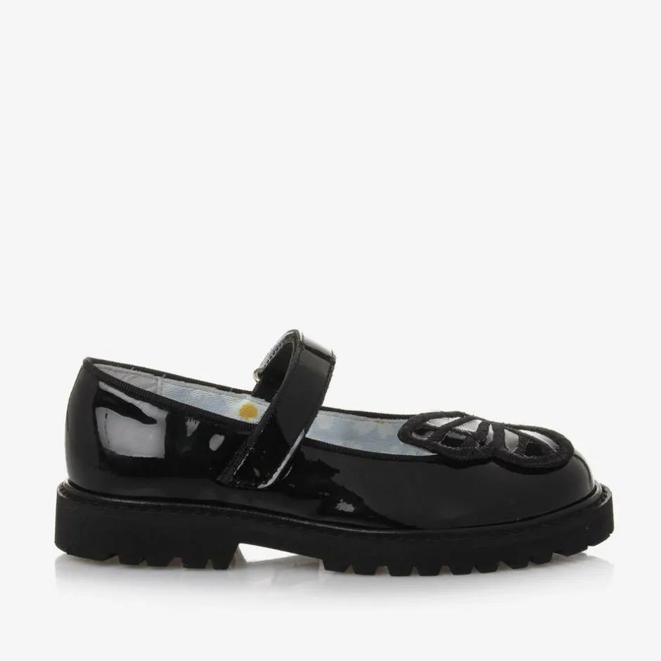 Smart black shoes for girls by British designer Sophia Webster Mini. They are made in shiny patent leather and trimmed with the designer's signature butterfly wings on the toes. The smooth leather insoles are cushioned for comfort and printed with a pretty daisy pattern. Suitable for school, they fasten easily with a velcro strap and have a chunky non-slip rubber sole for good grip.