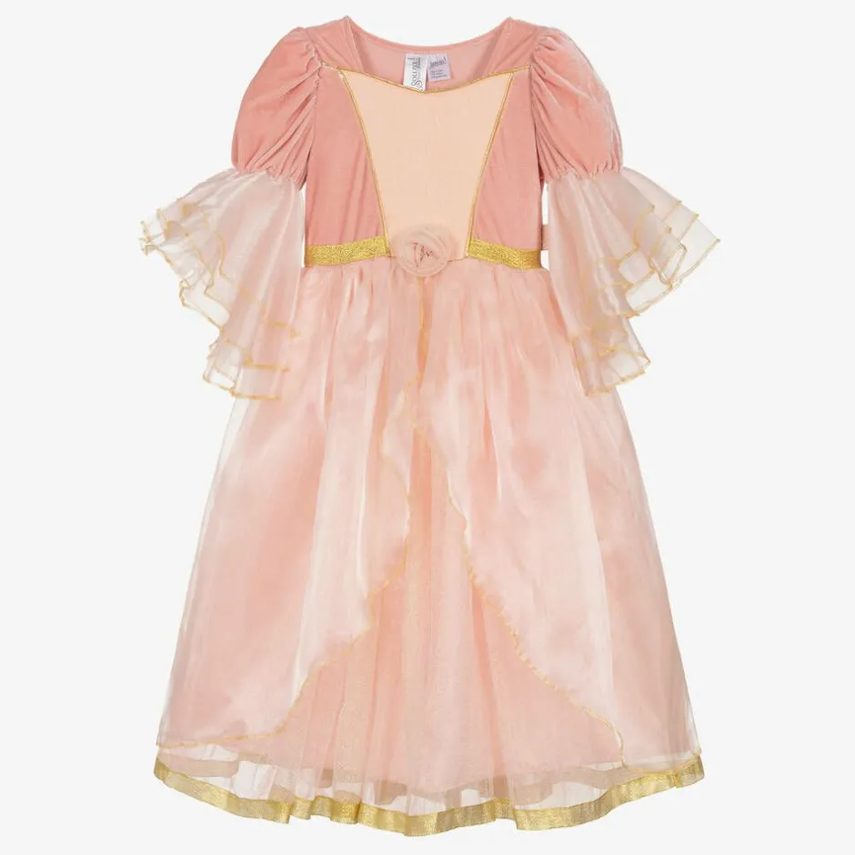 Girls will feel as pretty as a princess in this pink dress costume by Souza. Fabulous and striking, the bodice is shaped in a classic silhouette, with golden piping, soft velour, and a rose-patterned panel. The puffed sleeves are trimmed with voluminous layers of organza and the sparkling gold waist is detailed with a rose motif. The skirt is made in sparkling organza and gold dotted tulle, with a satin lining for comfort. The stretchy velour bodice ensures it is easy to slip on over the head.