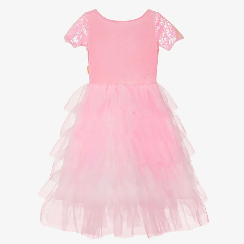 Girls will have so much fun in this fabulous pink party dress by Souza. The bodice is covered in sparkling sequins, the skirt cascades in a gradient of pink tulle, and the back is made in soft and stretchy velour for ease of dressing. With a softly woven skirt, this beautiful dress has scalloped, short sleeves. A sweet flower stitched on the waist completes this feminine look, fit for a little princess.