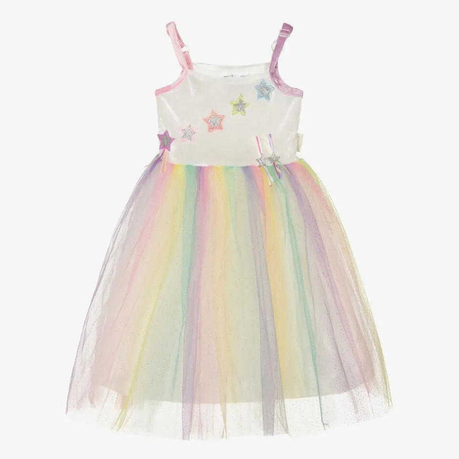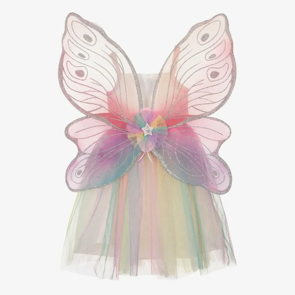 Girls white fairy dress and wings costume by Danish brand Souza. The bodice of the dress is made in soft and stretchy white velour embellished with glittery pink, yellow and blue stars. The narrow straps can be adjusted for a good fit. A silky satin skirt is beautifully overlaid with glittery, rainbow-coloured tulle that gathers on the waist. To finish off the look, the large set of wings have silver glitter trims and elasticated pink shoulder straps for comfortable wear.