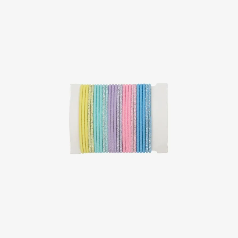 A pack of 25 thin hair elastics for girls by Souza. Soft and stretchy, these fabric elastics come in an assortment of bright colours, with two sparkly bands per colour.