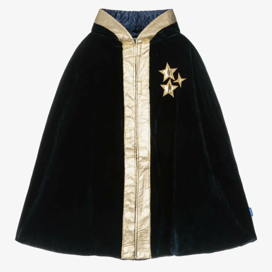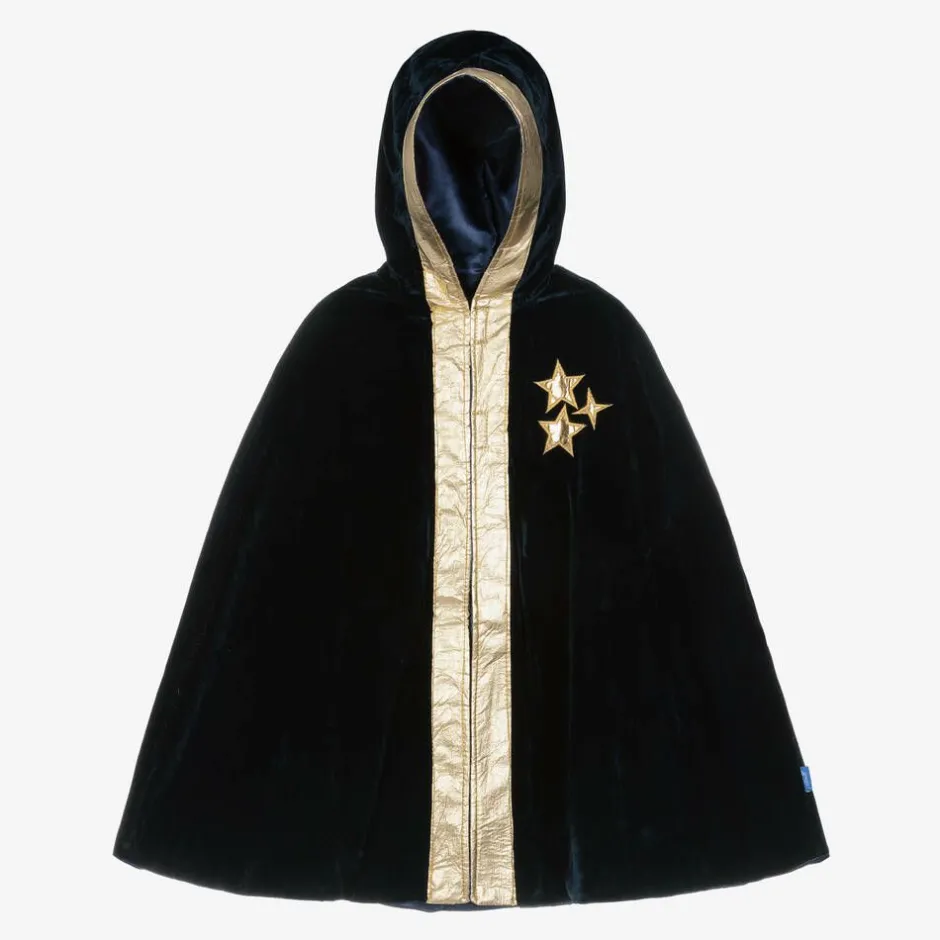 A navy blue wizard's cape for boys and girls by Souza, with a cloak-style hood. Great for a magical look, it is made from soft velour with a silky lining and fastens with velcro on the front. The metallic gold trim and star embellishments on the chest give an enchanting finish.