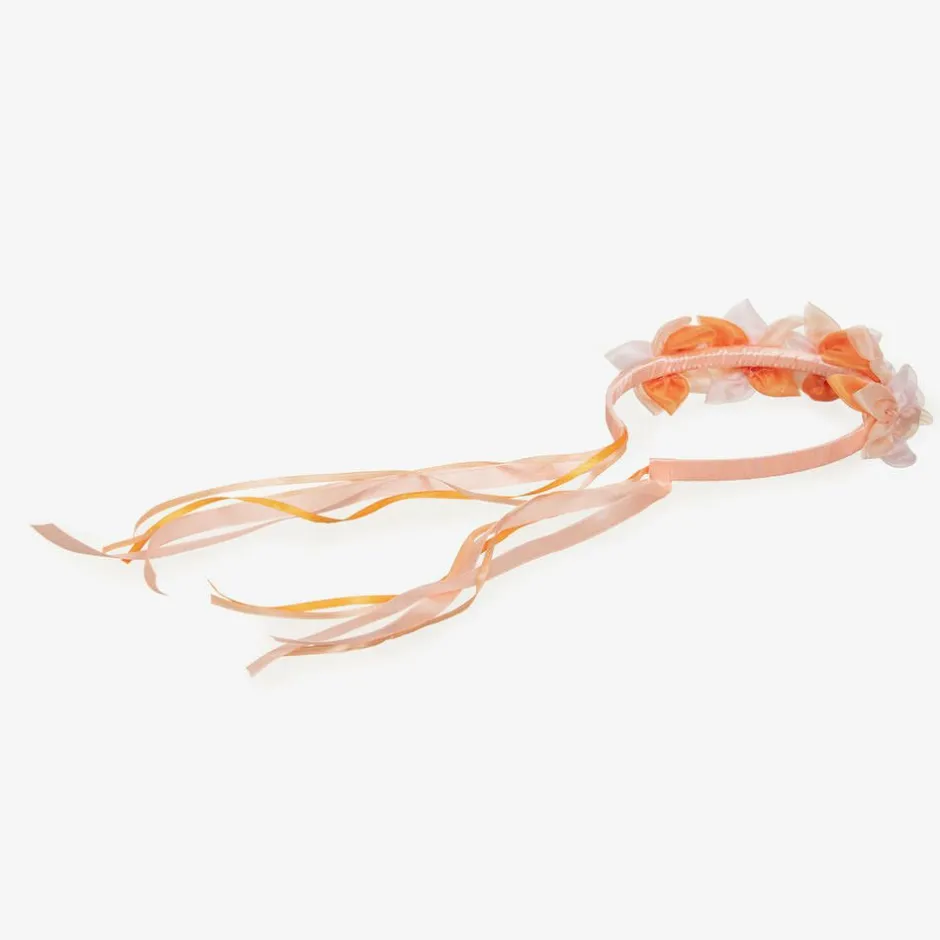 A lovely peach pink floral garland hairband for girls by Souza. The satin ribbon covered band has internal grips for a secure fit. The top is decorated with pink and orange chiffon flowers with sparkly sequin buds. There are satin ribbons to tie on the back.