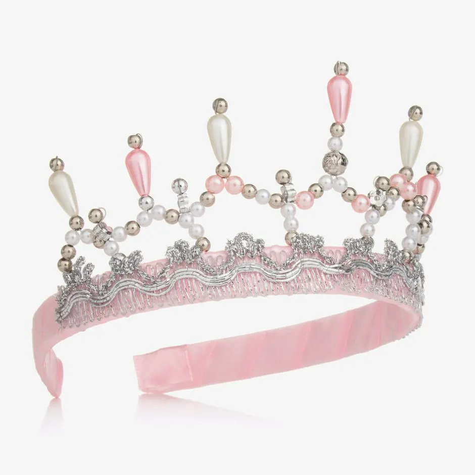 Girls pink and silver crown from Souza. The flexible band is covered in satin ribbon and the crown is decorated with pretty pink, silver and pearl beads.